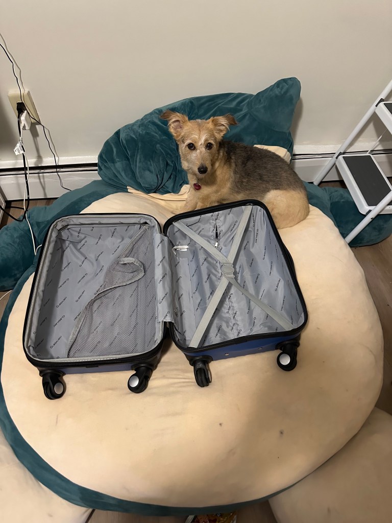 Suki the corgipoo is borderline precognitive about me leaving – though to be honest, the side-eye might have more to do with me gutting her bed than anything else. But enough about the Pokémon plush. It’s dead. R.I.P. Snorlax. I give Suki some head scratches and remind her that she’s coming with me, just not today.